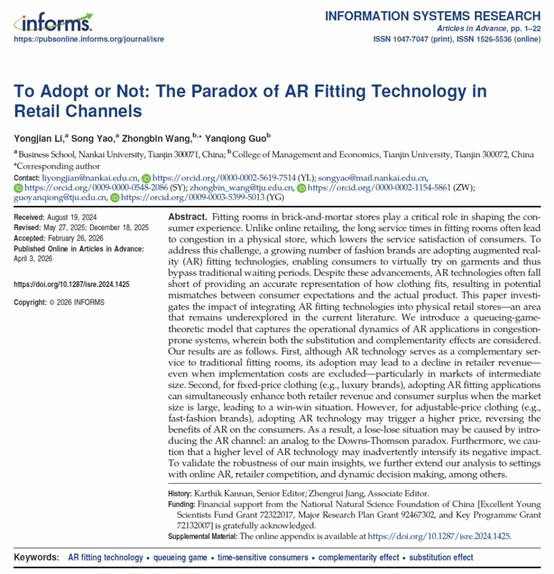 近日,九游 九游 系统工程研究所王钟彬教授作为通讯作者的论文《To Adopt or Not: The Paradox of AR Fitting Technology in Retail Channels》在信息系统领域的国际顶级期刊Information Systems Research在线发表。